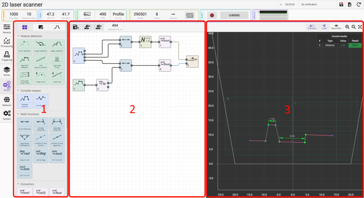 此外,该线激光轮廓扫描仪的另一创新点是智能化:整个ZLDS202系列线激光扫描仪都有内置的Web界面,用户可以直接通过web网页进行参数设置和算法设计。仅仅只需要通过拖动智能块图、创建连接就可以直接创建任意复杂性和独特性的算法,灵活实现各种场景(如汽车、铁路、机械加工、自动化生产等领域)中的测量外轮廓、厚度、高度、深度、边缘、凹槽、角度、圆度、平面度到变形……的各种功能!